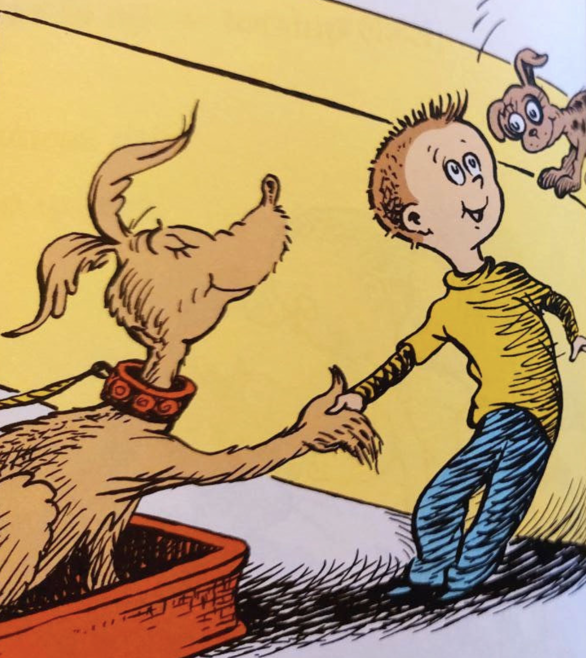 En esta historia escrita en verso nos comparten las demás opciones que van encontrando, como un ave, un conejo, y otros seres inventados por el Dr. Seuss. Al final, eligen la mascota perfecta.
