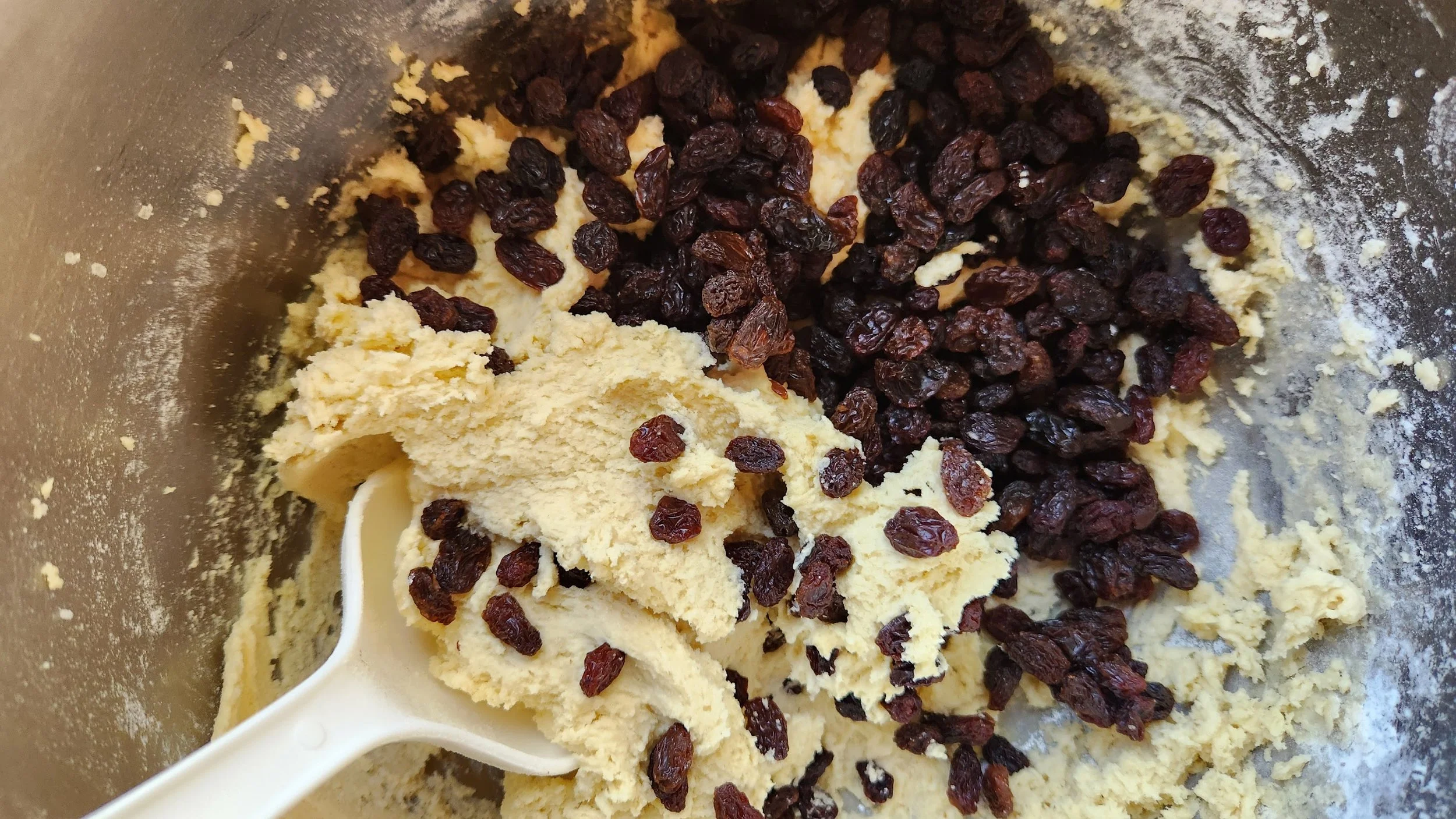 6. Echa la taza de pasas a la masa y mezcla con una espátula.