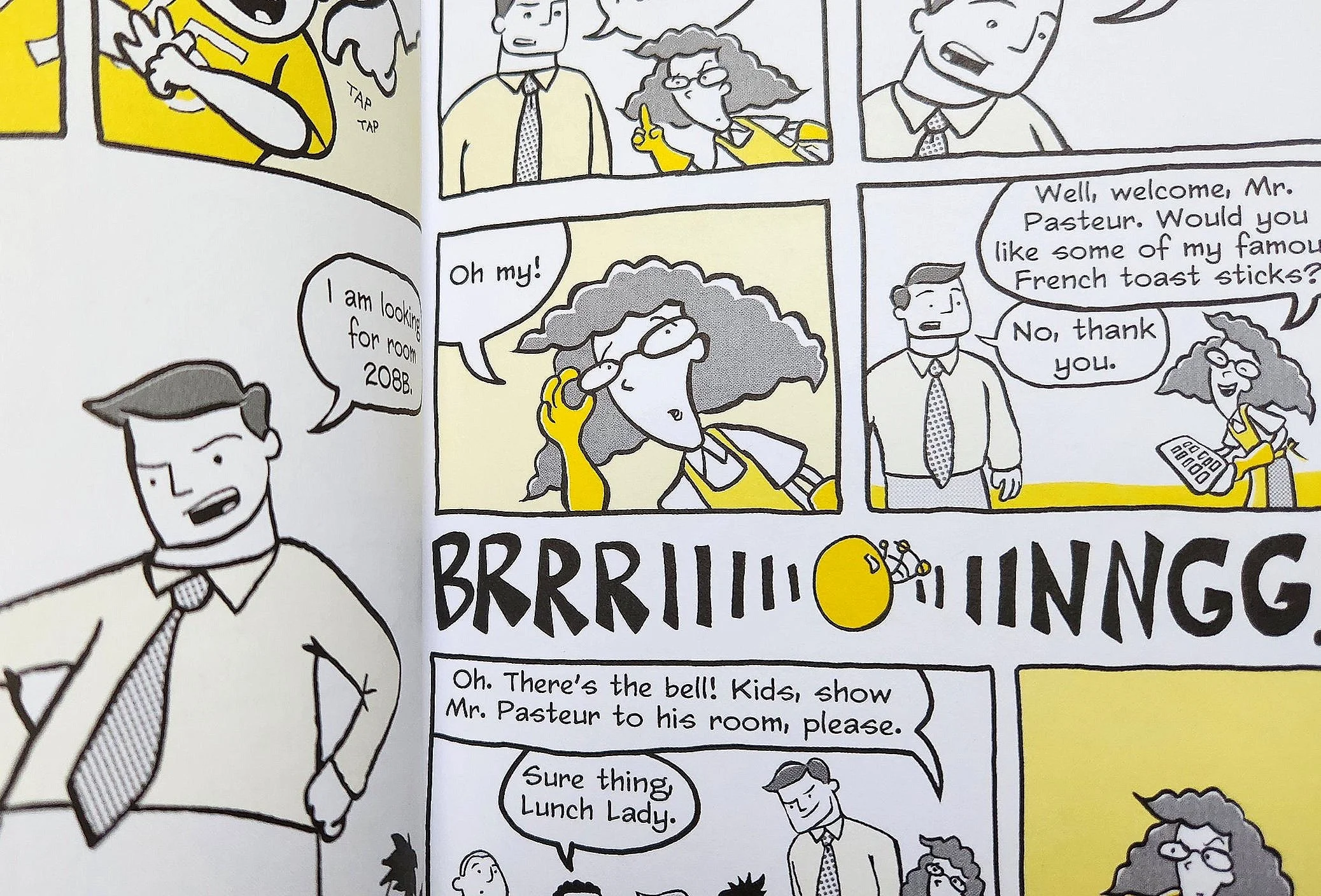 Es un cómic middle grade que rompe con la fórmula común, porque la protagonista es la señorita de la cafetería, no los niños. Y el hecho de que se use a una persona que se olvida o se subestima en el diario vivir, como lo es quien sirve el almuerzo, le da un toque extra. Además, no puedo dejar por un lado el encanto y la imaginación de la historia, específicamente de los artefactos: una laptop-azafate, una espátula-helicóptero y unos nunchaku de barritas de pescado.